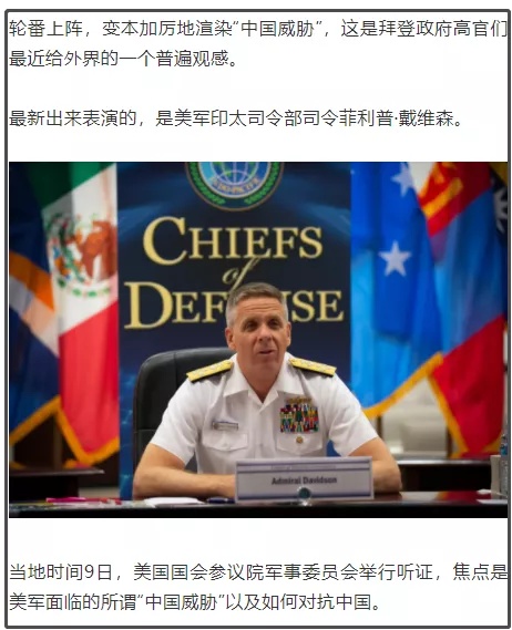 比如前天,美軍印太司令在進行聽證的時候,去變本加厲地渲染我們對美國的威脅。