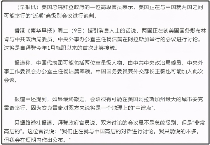 然後到了昨天早上,美國方面就開始密集披露“有可能”與我們進行高級別會晤的一些信息。