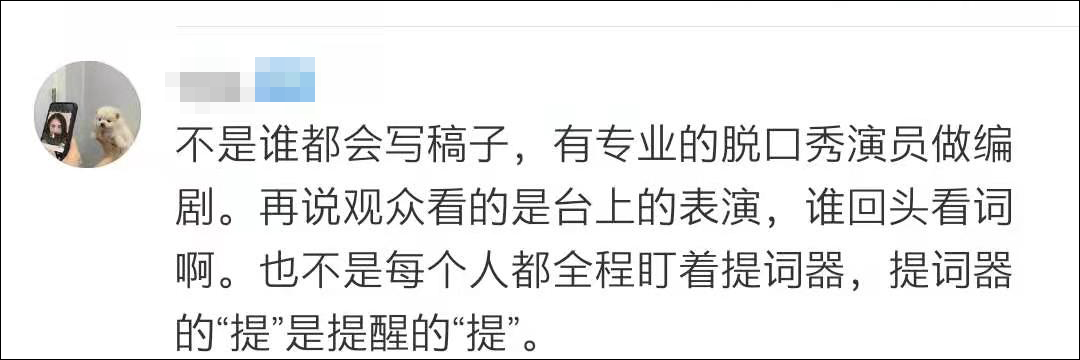 該製片人表示:“脱口秀並不是即興表演,是有段子手精妙的設計在裏面。所以有提詞器並不是説藝人不夠努力不背稿,而是為了讓每個表演者能夠踩準那個設計好的點。”