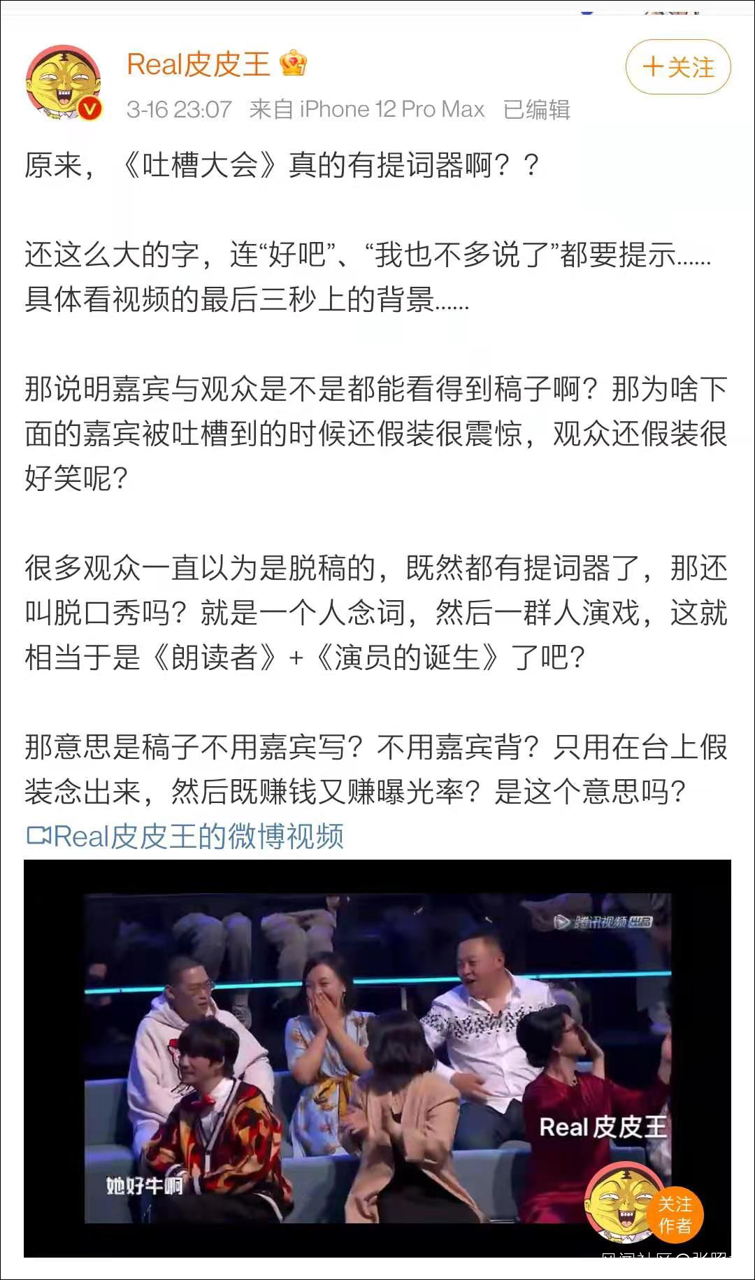 3月16日,娛樂博主@Real皮皮王 發帖,吐槽《吐槽大會》上的提詞器。