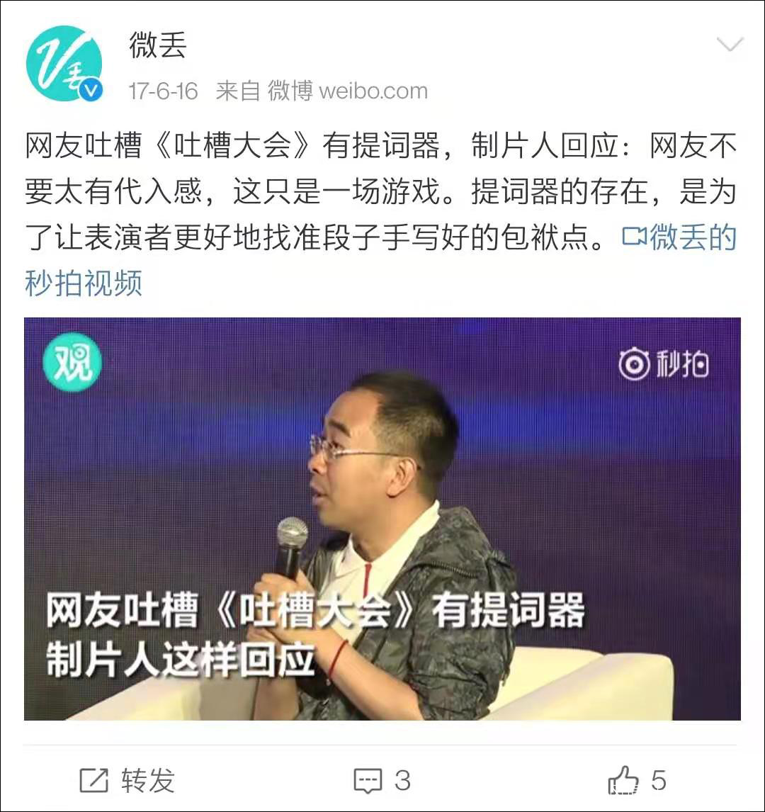 事實上,關於提詞器的爭議,《吐槽大會》的製片人早在2017年就回應過。