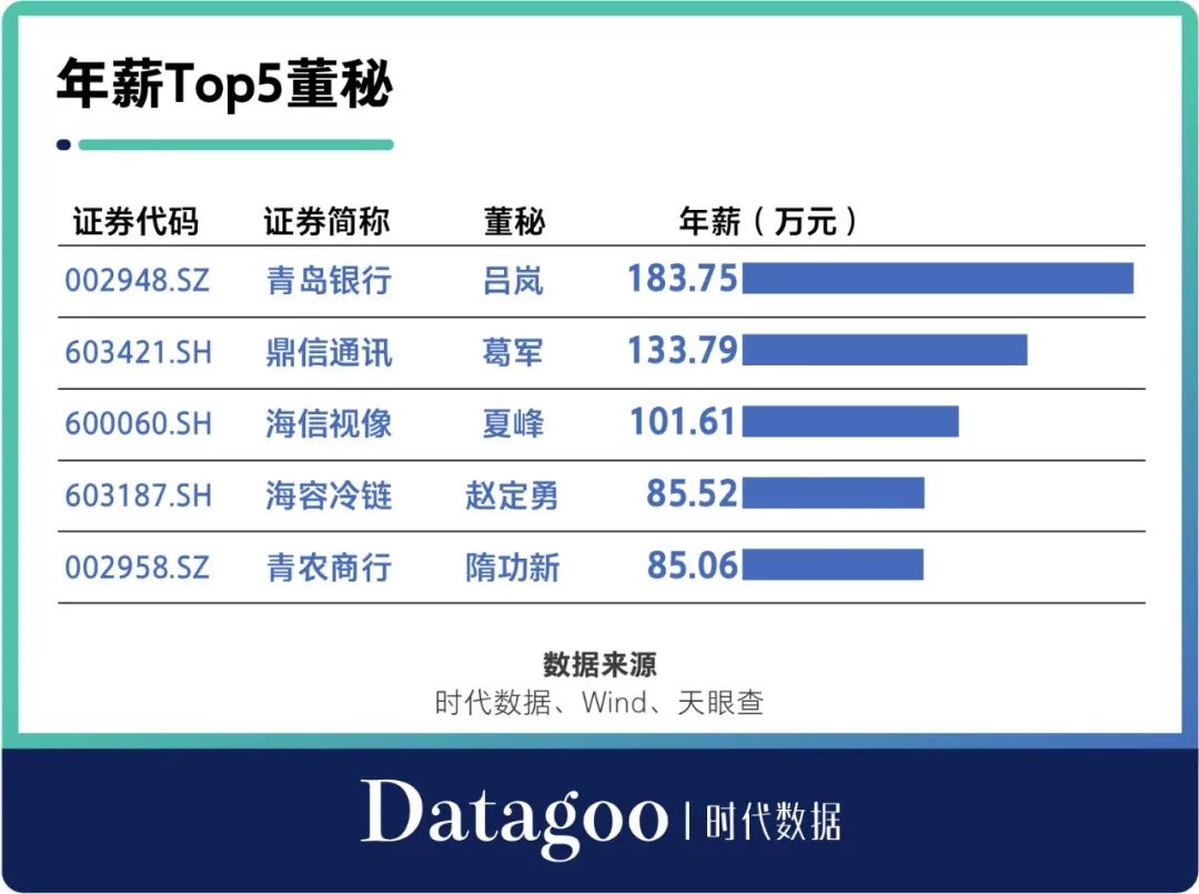 **據時代數據統計,在這47家公司中,僅3家公司的董秘2019年年薪超過100萬元。**其中,最高的是青島銀行(002948)董秘呂嵐,年薪183.75萬元;鼎信通訊(603421)董秘葛軍緊隨其後,年薪133.79萬元;海信視像(600060)董秘夏峯年薪101.61萬元排第三。