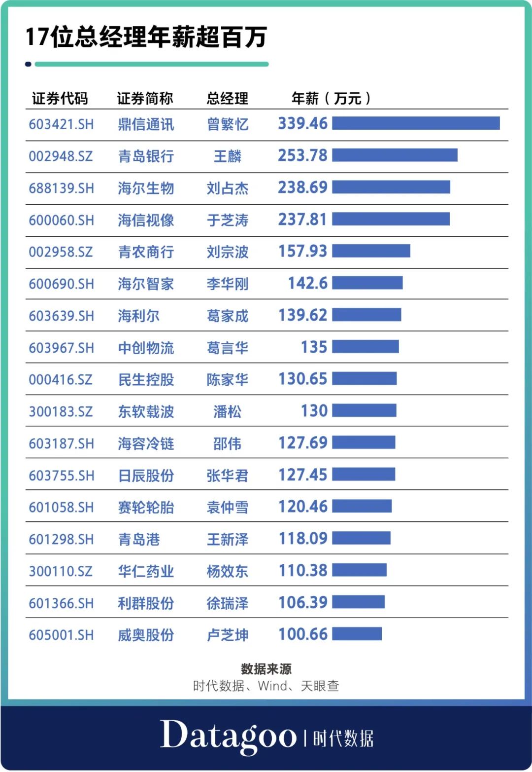 **據時代數據統計,在這47家公司中,一共有17家公司的總經理2019年年薪超過100萬元。**其中,年薪排第一的是鼎信通訊(603421)總經理曾繁憶,年薪達339.46萬元;其後,青島銀行(002948)行長王麟年薪253.78萬元,排在第二;海爾生物(688139)總經理劉佔傑年薪238.69萬元,排在第三。
