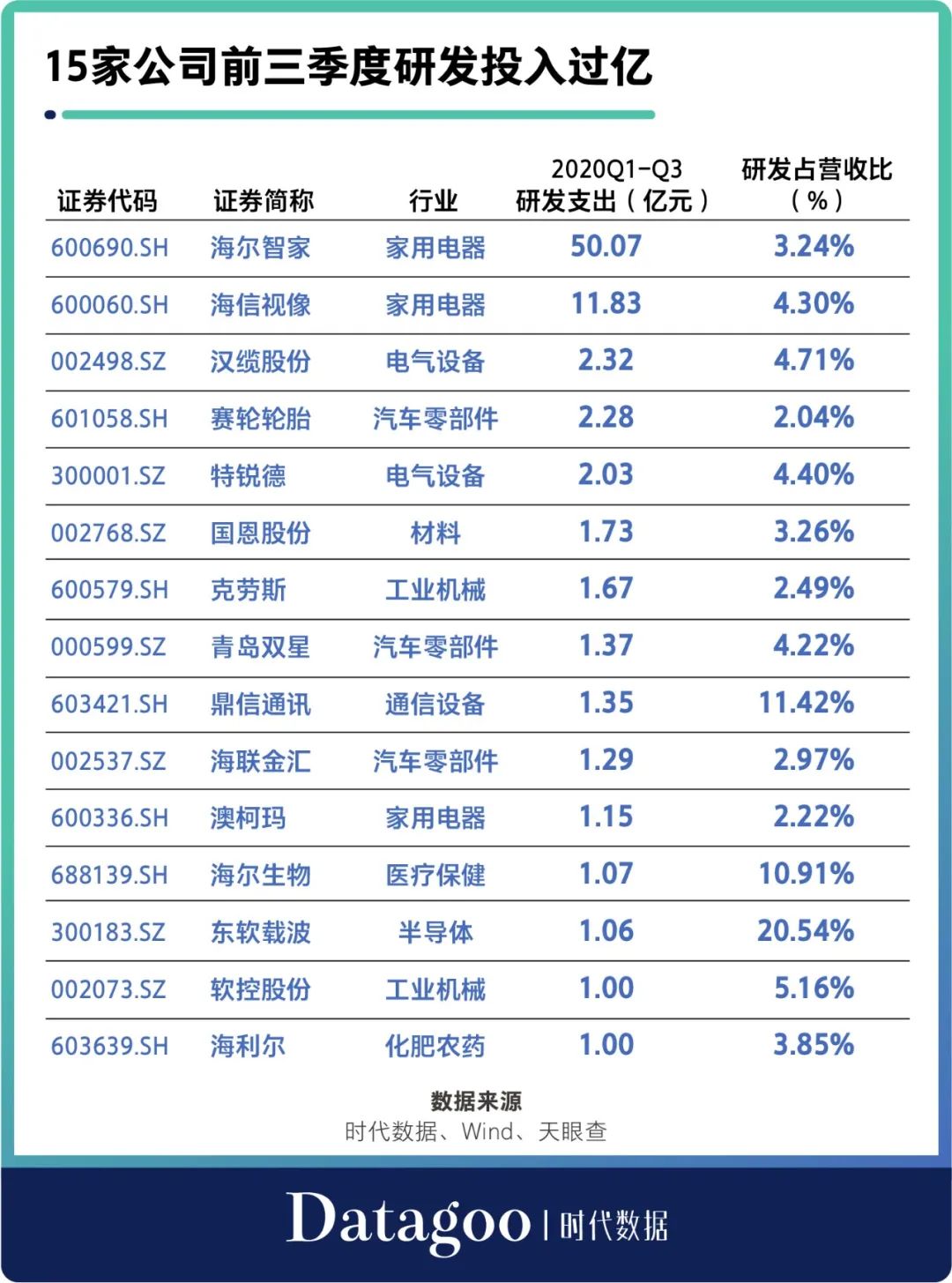 科技創新是企業持續發展的動力。隨着青島新興產業的崛起,新老製造企業在科技研發方面的投入也不斷增加。**據時代數據統計,這47家上市公司2020年前三季度在研發方面的平均投入達到1.87億元。**其中,研發投入達到1億元的上市公司有15家。