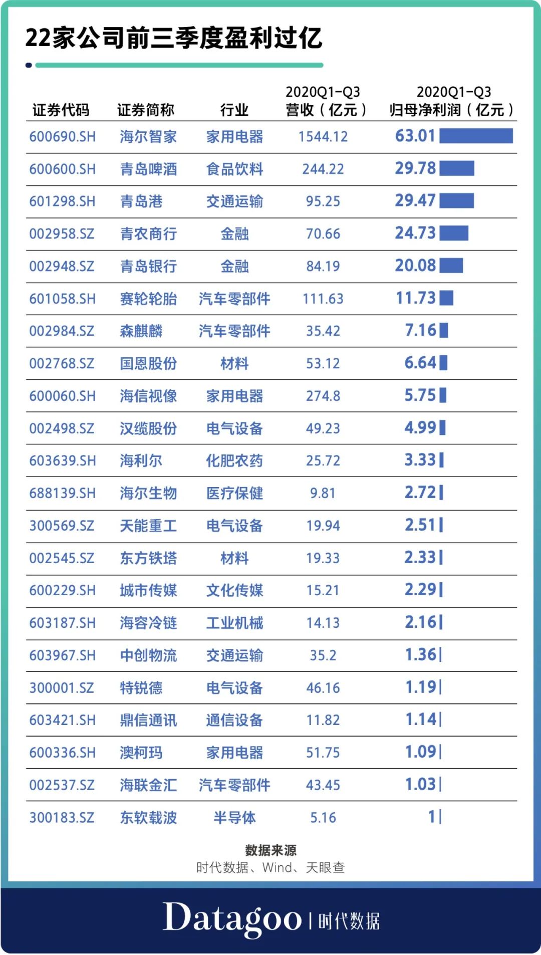 此外,**前三季度淨利潤超過10億元有6家。**其中,海爾智家(600690)業績高居第一,前三季度營收1544.12億元、歸母淨利潤63.01億元。其後,青島啤酒(600600)前三季度營收244.22億元、歸母淨利潤29.78億元。此外,全球最大綜合性港口之一青島港(601298)前三季度營收95.25億元,淨利潤高達29.47億元,排在第三。