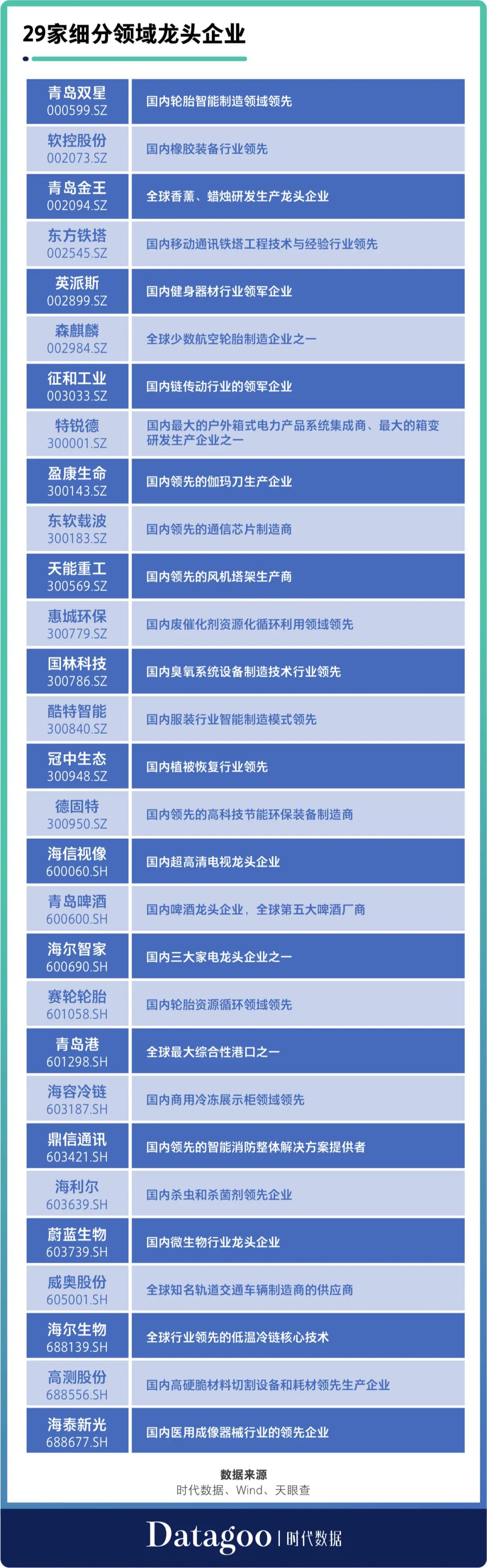 **據時代數據梳理,在47家公司中,有29家公司屬於各個行業細分領域的龍頭型企業,佔比超六成。**其中,青島金王(002094)、森麒麟(002984)、青島啤酒(600600)、青島港(601298)、威奧股份(605001)、海爾生物(688139)等企業的產品銷量、生產技術以及經營規模已經做到全球領先;海爾智家(600690)、海信視像(600060)等國產電器品牌也享譽全球。