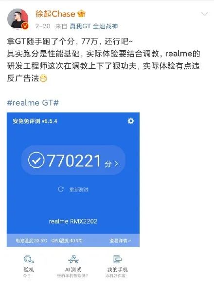 他表示 realme 即將推出的新旗艦 GT ,在研發工程師狠狠的調教下,在安兔兔上跑出了 77 萬的高分。