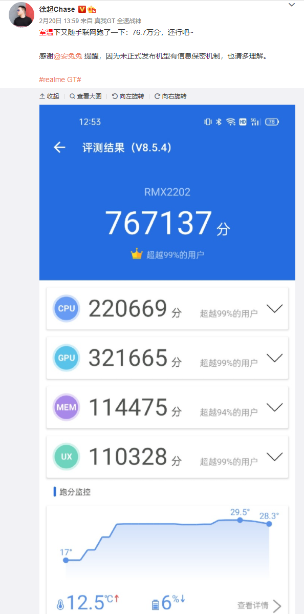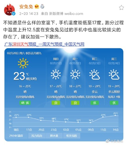 但這個成績顯然也沒能讓安兔兔信服。他們直接搬出了當天深圳的天氣温度,質疑 realme GT 的室温和抬升温度都不正常。