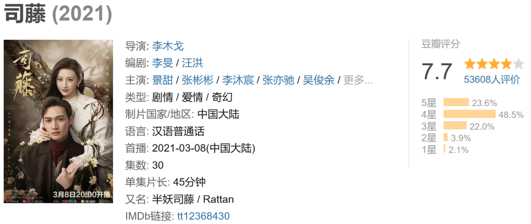 不過,也正得益於優酷的分銷,《司藤》能夠有更多的渠道連接市場,加速作品釋放聲量。而在更大的市場覆蓋範圍下,《司藤》的口碑優勢也能夠更大程度地轉化為引流籌碼,不斷強化作品發酵的長尾效應。