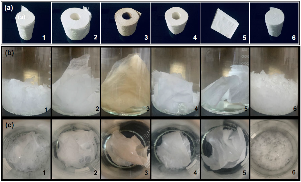 國內5種暢銷廁紙(1-5)和符合標準的可衝廁紙(6)在水中的分解情況 | 圖源:Sun, S. et al.(2021)