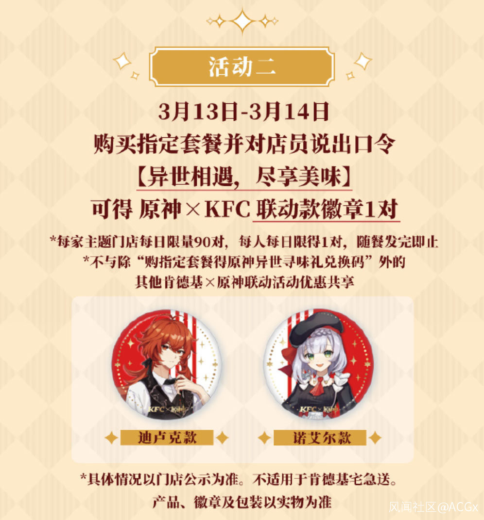 從聯動的規劃上看,此次“KFC×原神聯動”的實際活動內容並不複雜,簡單總結下來主要就是以下幾點:在活動規定的時間內,註冊或者登陸為KFC的WOW會員後,到KFC門店購買指定套餐,即可獲得相應的遊戲道具禮包或限定周邊;