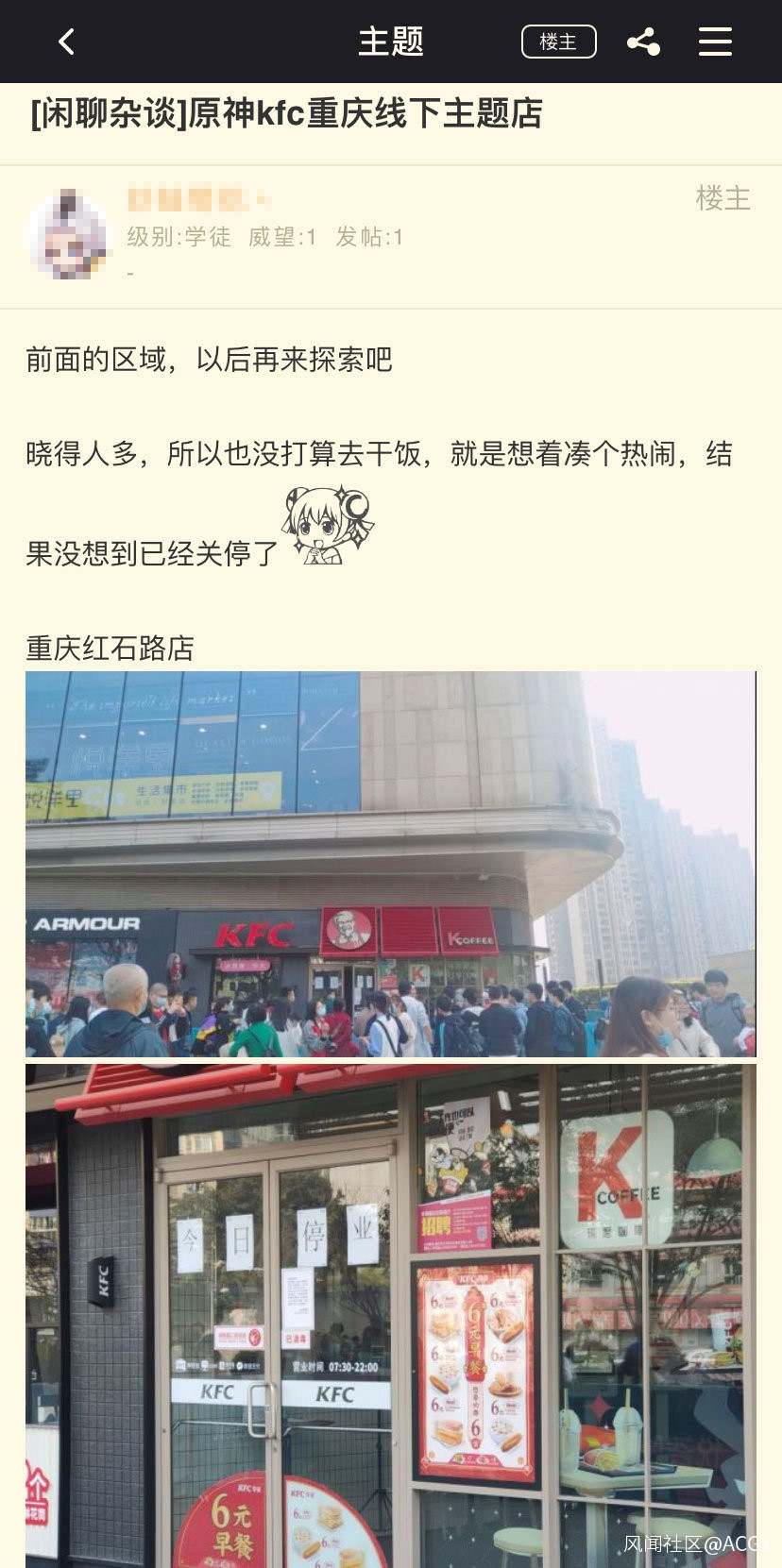 或許是由於參與活動的人數大大超出了預期,也或許是聯動雙方並沒有提前制定相應的預案,包括上海市新宜街、杭州市東坡路等在內的許多KFC原神主題門店,都因為疫情防控要求被迫取消了活動。而在NGA論壇上也有二次元愛好者發帖指出,重慶紅石路KFC原神主題門店,甚至還直接停業,原因很有可能是現場活動組織異常混亂,以及KFC方面沒有將此次活動進行報備所導致。