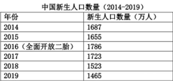 人口是國家的根本,人口的數量與結構直接關乎國家興衰。當下我國人口結構主要面臨兩個重要問題,一是老齡化嚴重,二是新生人口嚴重不足。2019年,我國人口65歲以上的人口占比12.6%,創歷史新高,新生人口數量僅為1465萬人,人口出生率為10.48‰,創歷史新低。如若任由這種趨勢進行下去,不久我國將會面臨適齡勞動力數量減少、社會負擔加重以及產業升級受阻等一系列問題,甚至會直接威脅到社會的穩定與存續。為此,國家於2016年正式施行“二胎政策”,試圖通過生育政策調整來扭轉這一趨勢。(詳見下表)