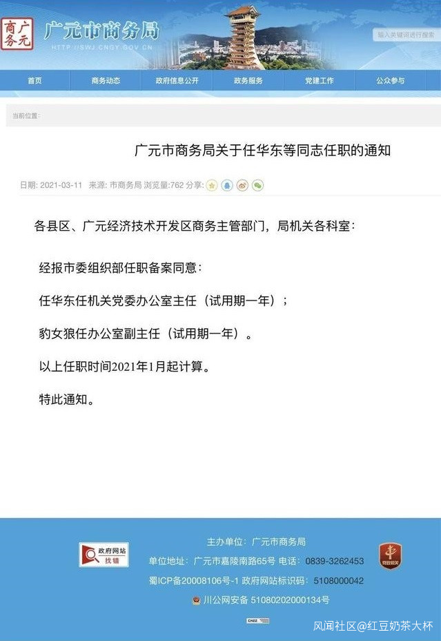近日,四川省廣元市商務局在其官網上發佈了一份人事任命,稱經報廣元市委組織部任職備案同意:任華東任機關黨委辦公室主任(試用期一年);豹女狼任辦公室副主任(試用期一年);任職時間自2021年1月起計算。