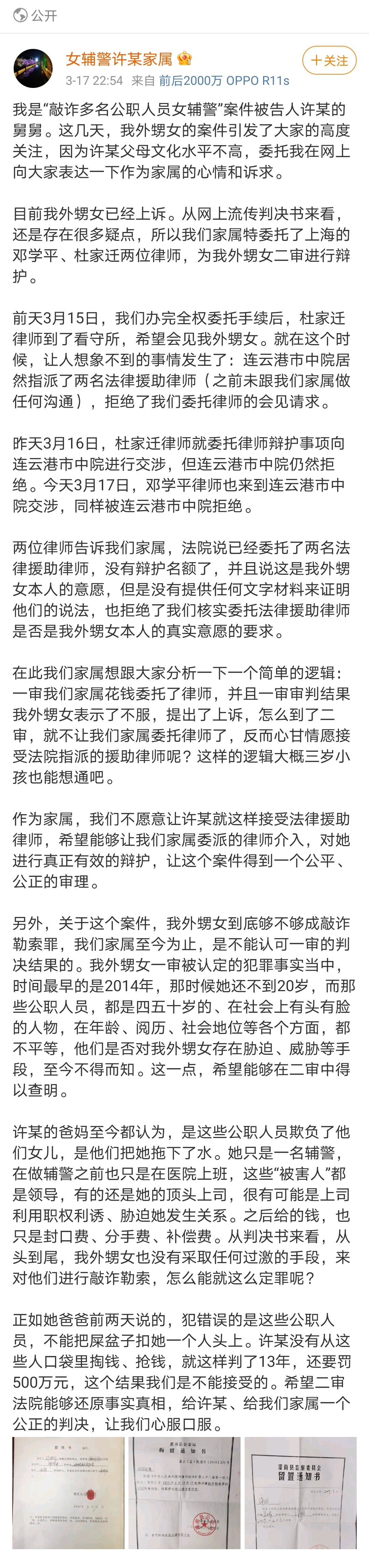 3月17日,女輔警舅舅以“女輔警許某家屬”為名,深夜在微博發聲。