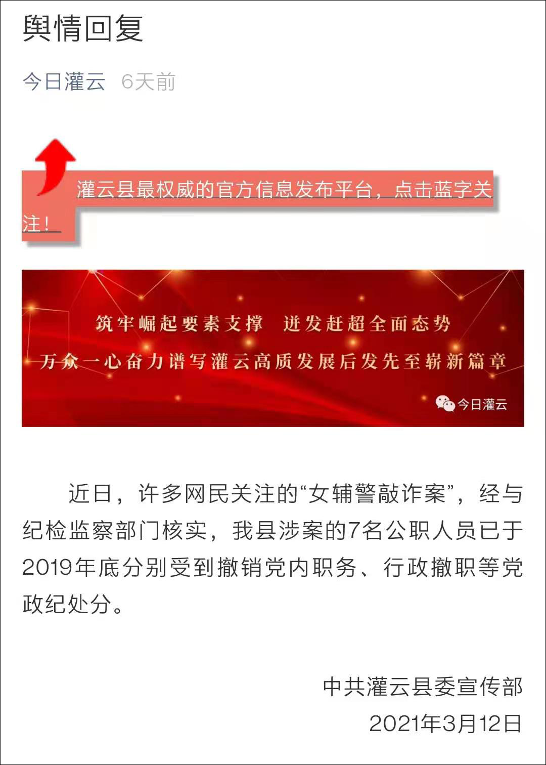 此事引發社會高度關注後,3月12日,灌雲縣融媒體中心微信公眾號“今日灌雲”回應稱,近日,許多網民關注的“女輔警敲詐案”,經與紀檢監察部門核實,我縣涉案的7名公職人員已於2019年底分別受到撤銷黨內職務、行政撤職等黨政紀處分。