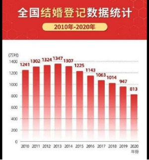 由於中國未婚生育比例不高,一胎出生與之前1-3年的年青人口結婚數據是高度相關的。而中國的結婚登記人數,與一胎出生數,在近年來確實發生了關聯性的大降。結婚登記對數從2013年的1347萬對連降七年,降到了2020年的813萬對,降了39.6%,年均下降7%。但是這個結婚登記是包括再婚的,年青人口初婚登記數量的降幅還要更高。