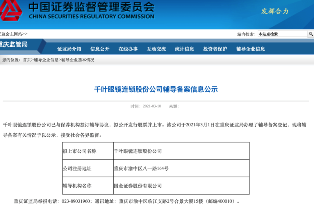 根據重慶證監局官網信息,重慶知名眼鏡品牌企業——千葉眼鏡連鎖股份公司(下稱千葉眼鏡)近日已在重慶證監局辦理了上市輔導備案登記,擬公開發行股票並上市。