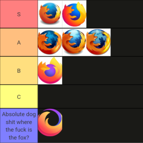 下面這張為歷來的火狐商標打出評價的階梯圖,集中表達了他們的訴求。年代最久遠的兩款LOGO被評為了最優秀的S級,而最新的LOGO位列倒數第一,評語如下:“絕對的狗屎,狐狸到底去哪兒了?”