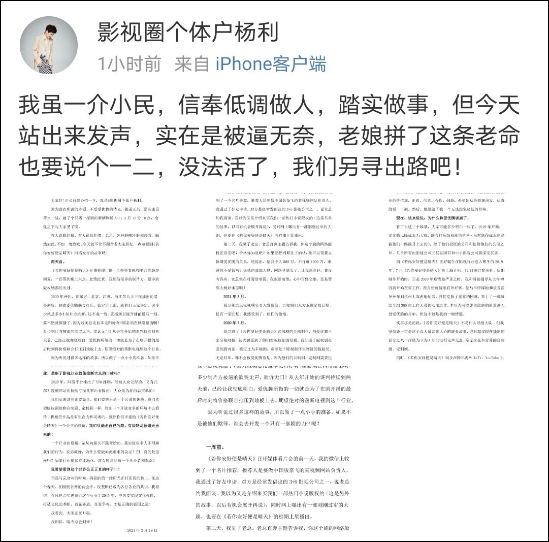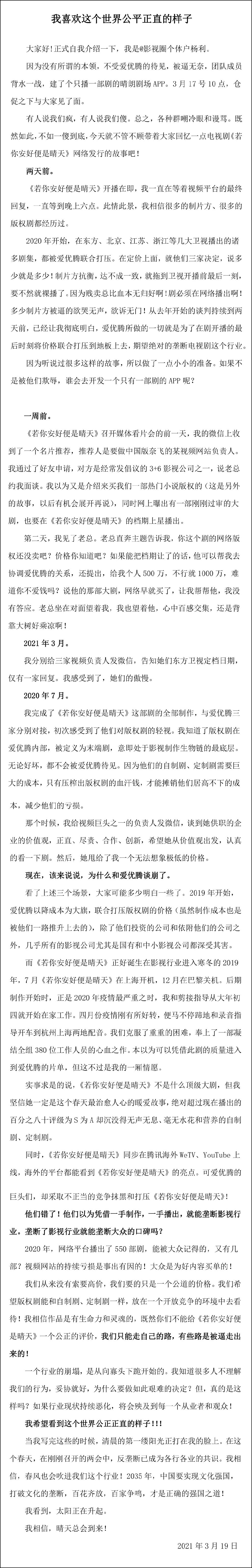 而在19日下午,《若你安好,便是晴天》製片人楊利又在微博上發了長文解釋為什麼拒絕愛優騰。