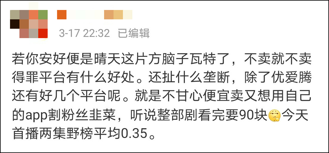 另外也有網友指出,即使愛優騰三家壟斷,製片方仍然可以有很多選擇,比如説芒果TV、搜狐視頻、咪咕視頻、PP聚力,甚至是央視頻都行;而讓人不得不質疑的是,《若你安好,便是晴天》的海外播出平台選擇了騰訊旗下的WeTV,如果利益相關的話,那製片方也不應該選擇WeTV啊。