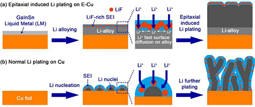 圖5. 外延誘導電鍍鋰的概念。(a)E-Cu上Li合金化和外延誘導電鍍行為的圖解。(b)Cu表面Li形核和電鍍行為的圖解。