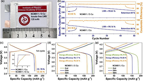 圖6. 無負極NCM811/ E-Cu軟包電池的展示。(a)120mAh總容量多層無負極軟包電池的數碼照片。(b)NCM811/ E-Cu(up)和NCM811/ Cu(down)軟包電池的循環性能。(c)NCM811/ E-Cu和NCM811/ Cu軟包電池的電壓曲線。(d)NCM811/ E-Cu和(e)NCM811/ Cu軟包電池不同循環圈數下的電壓曲線。