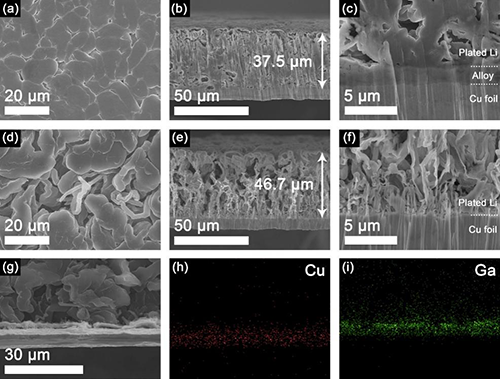 圖7. E-Cu和Cu集流體上的鍍鋰行為。在0.5mA cm-2電流密度下電鍍5mAhcm-2鋰後E-Cu集流體的(a)SEM圖像和(b)、(c)橫截面掃描電鏡圖像。在0.5mA cm-2電流密度下電鍍5mAhcm-2鋰後Cu集流體。(d)SEM圖像和(e)、(f)橫截面掃描電鏡圖像。在0.5mA cm-2電流密度下電鍍5mAhcm-2鋰後E-Cu集流體的(g)S橫截面掃描電鏡圖像及相應的(h)Cu和(j)Ga EDS元素分佈圖。