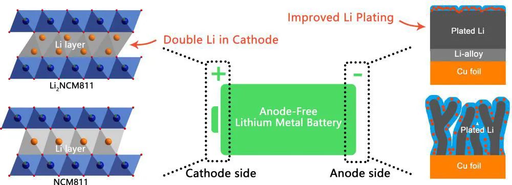 圖1. 分別從正極、負極側改善無負極鋰金屬電池循環壽命示策略意圖。
