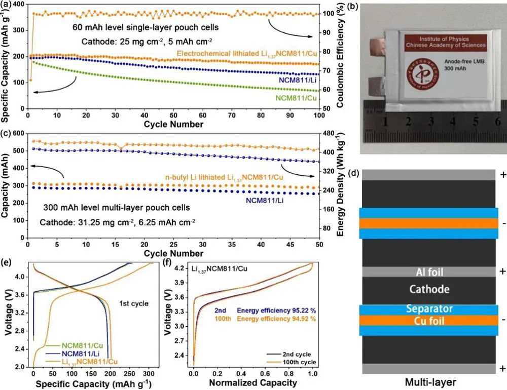 圖3. Li2NCM811材料在無負極軟包電池中電化學性能展示。(a)單層軟包電池性能對比。(b)多層軟包電池照片。(c)多層軟包電池性能對比。(d)多層軟包電池結構示意圖。(e)單層軟包電池首次充放電曲線對比。(f)第2次循環與第100次循環能量效率對比。