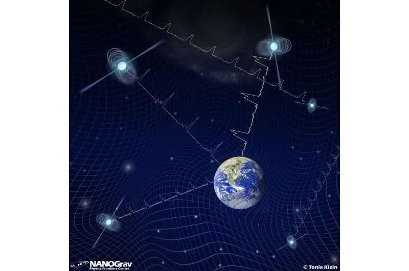 地球嵌入被引力波變形的時空,引力波也對來自被觀測脈衝星的無線電波產生影響。圖片來源:NANOGrav/T. Klein
