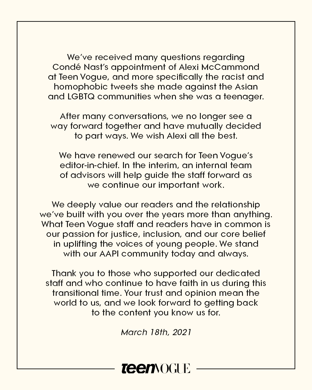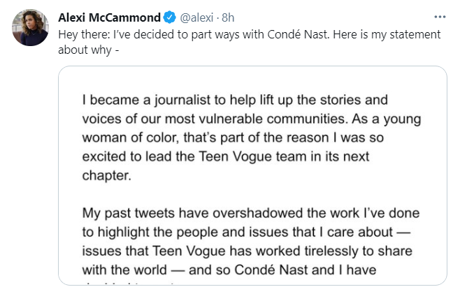 “我過去的推文給我的努力蒙上了一層陰影,我一直在努力讓我關心的人和問題得到重視——這也是《 Teen Vogue 》樂此不疲地與世界所分享的——基於此,康泰納仕集團和我決定分道揚鑣。”
