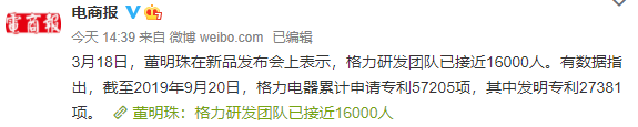 格力電器董事長兼總裁董明珠在新品發佈會上表示,格力研發團隊已接近16000人。