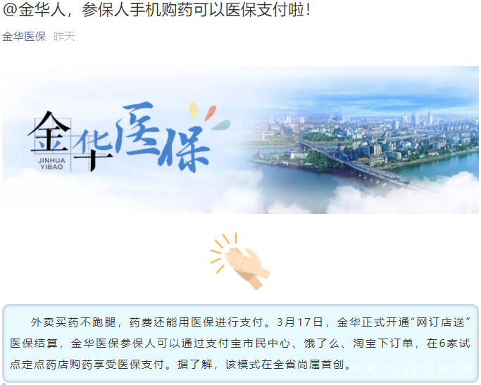 全國首個外賣刷醫保買藥試點落地浙江金華,當地參保人可以通過支付寶、餓了麼、淘寶下單進行購買。