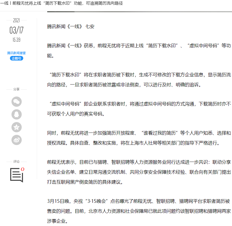 前程無憂近期將上線“簡歷下載水印”、“虛擬中間號碼”等功能,保障平台用户個人信息安全;同時,前程無憂也將進一步完善個人用户操作流程等相關內容。