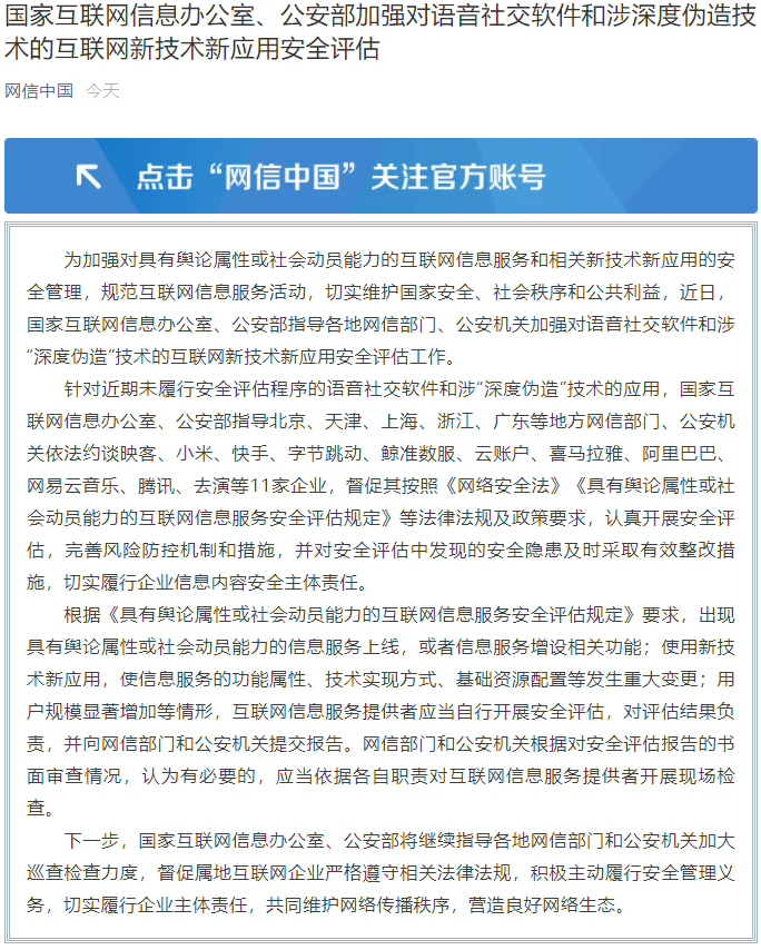 針對近期未履行安全評估程序的語音社交軟件和涉“深度偽造”技術的應用,小米、快手、字節跳動、阿里巴巴、騰訊等11家企業被約談。