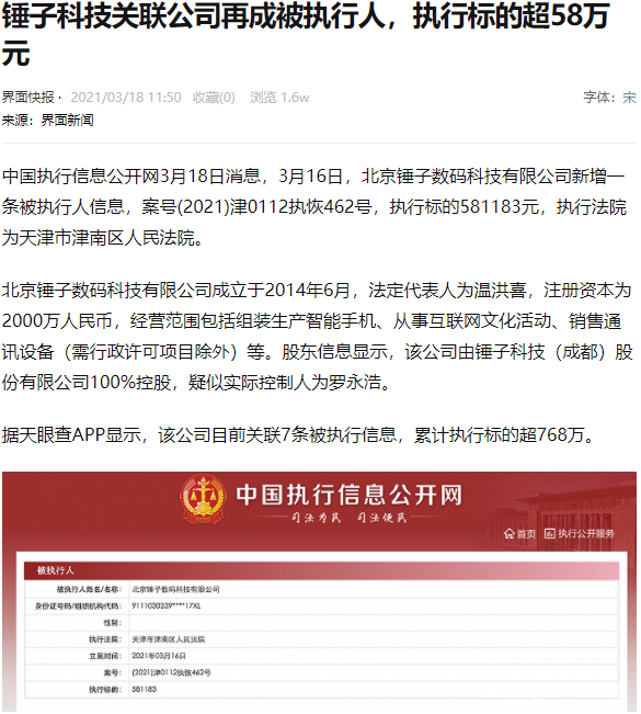 錘子科技關聯公司再成被執行人,執行標的超58萬元。該公司目前關聯7條被執行信息,累計執行標的超768萬。
