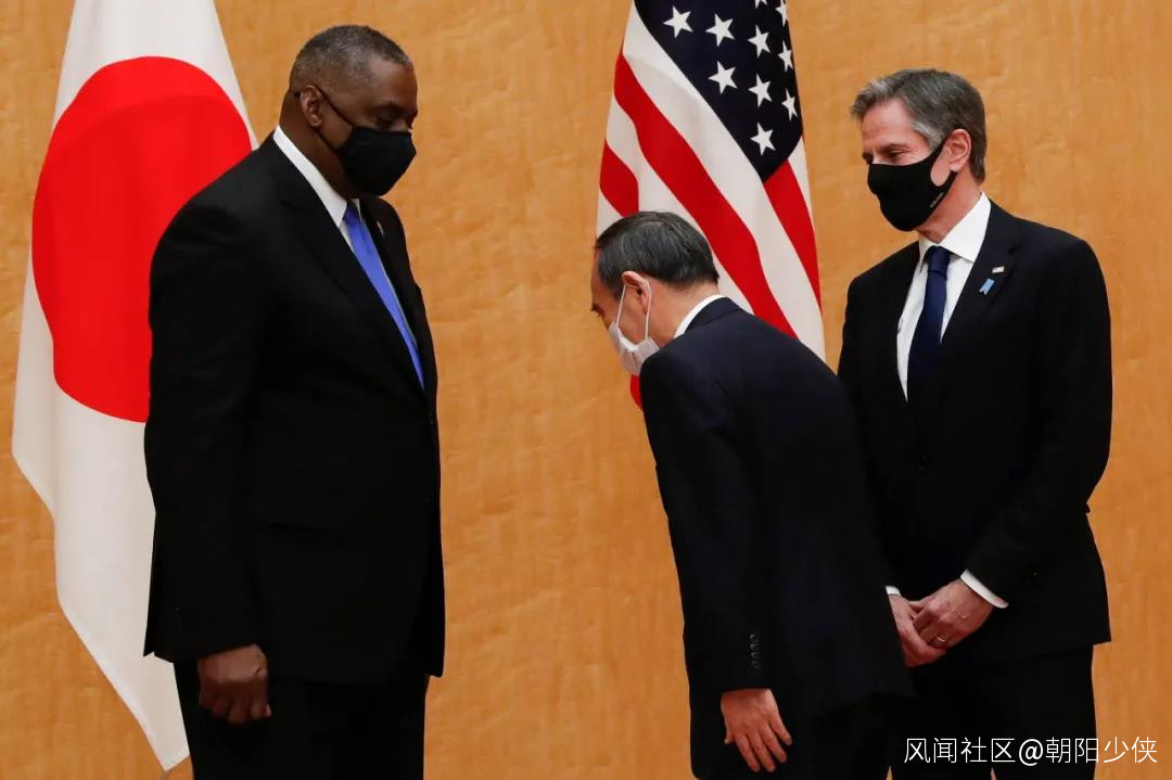 2021年3月16日,日本首相菅義偉(中)會見訪日的美國國務卿布林肯(右)和國防部長奧斯汀(左)