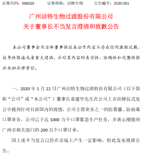 然而,次日公司的一紙公告將其“打臉”。據潔特生物(688026)2020年1月23日澄清和致歉公告顯示,主營口罩業務的子公司廣州拜費爾空氣淨化材料有限公司(以下簡稱“子公司”)已長期處於虧損狀態,正處於註銷公告階段,且因子公司口罩生產所需原材料備貨不足,200萬個口罩難以生產出來。