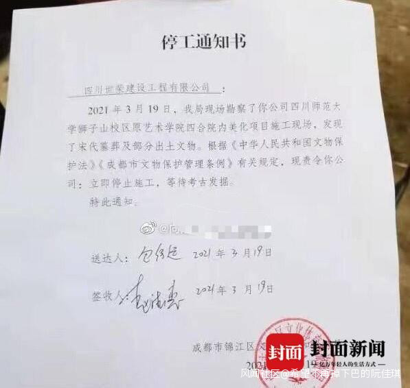 還有網友曬出一則停工通知書,通知書內容顯示,在四川師範大學獅子山校區原藝術學院四合院內梅花項目施工現場,發現了宋代墓葬及部分出土文物,成都市錦江區文旅局於3月19日要求該施工單位暫停施工。