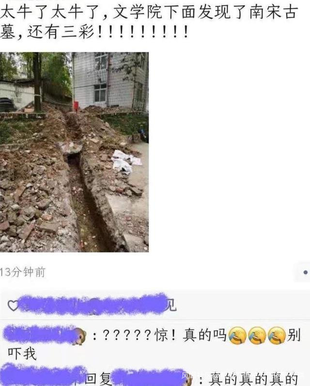 據封面新聞21日報道,這兩天一張圖片在四川師範大學獅子山校區學生的朋友圈流傳,稱在該校文學院的地下發現了南宋古墓,還挖出了唐三彩。