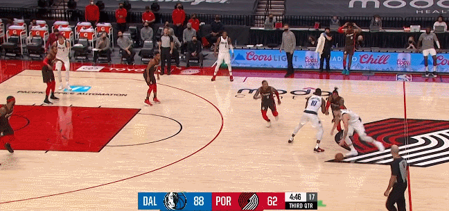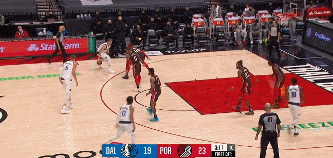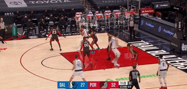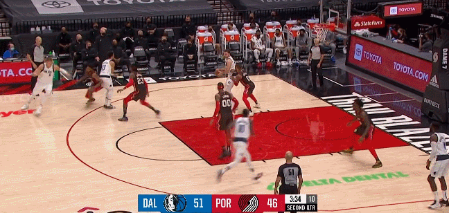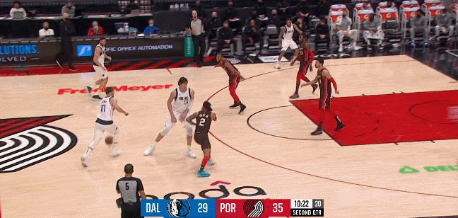 第二節特別明顯,東契奇不斷到低位單打特倫特和利拉德,開拓者如果不夾擊,他就自己得分,如果夾擊,他就給外線的隊友投三分,打得開拓者一點脾氣都沒有。