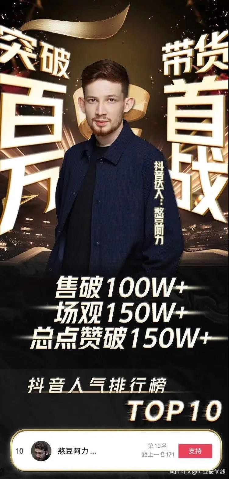 這場直播開始後熱度不斷上升,很快就進入了抖音人氣榜的前十,帶貨銷售額將近百萬,直播間場觀人次、點贊量均突破了150萬。這份戰報對於首次帶貨直播的新手主播來説,可謂成績不菲。作為短視頻博主的“憨豆阿力”轉型初戰告捷。