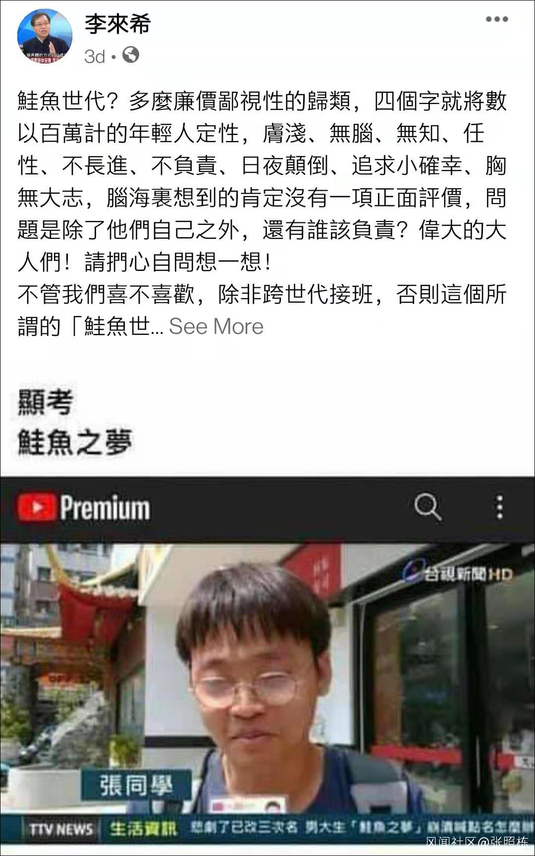 台灣公務人員協會前理事長李來希19日在臉書發文表示,孩子們現在的形象是父母或長輩們形塑的結果,孩子們的錯在於無知,長輩們的錯呢?是我們縱容任性的結果,還是長輩們的行為有意無意間耳濡目染所導致的社會亂象?