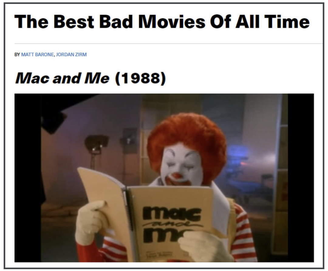 很少有人能夠真正確切地評價麥當勞整的這出《邁克和我》(Mac and Me)。