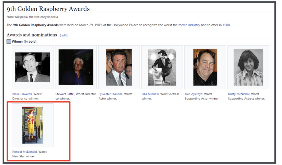 但麥當勞無法抹殺掉觀眾的記憶,也無法毀掉麥當勞叔叔成為首個捧得金酸梅最差新星獎的虛擬人物的鐵證。