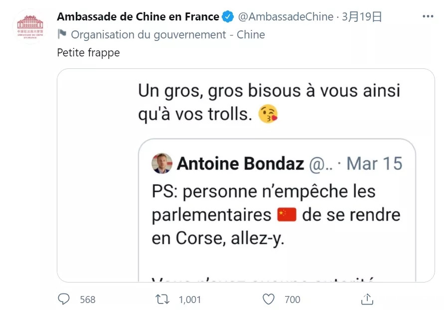 法國學者邦達茲在一個推特中為此叫好,並且衝中國駐法大使館説:給你和你的妖魔們一個大大的吻。中國大使館隨後在使館的官方推特上貼出邦達茲的推文,回了他一句“小流氓”。