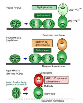 但在衰老過程或應激狀態下,HFSC則通過非典型的“應激響應”型非對稱細胞分裂,這種分裂伴隨着半橋粒蛋白COL17A1和細胞極性蛋白aPKCλ的失穩性。