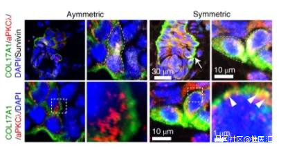 幹細胞分裂方向可以通過外部因素(如β1-整合素)或內部細胞極性蛋白aPKCλ(調節單層上皮細胞SCD過程中的紡錘體定位)調控。通過aPKCλ的穩定作用,實驗性誘導COL17A1的穩定性可拯救器官的體內穩態。