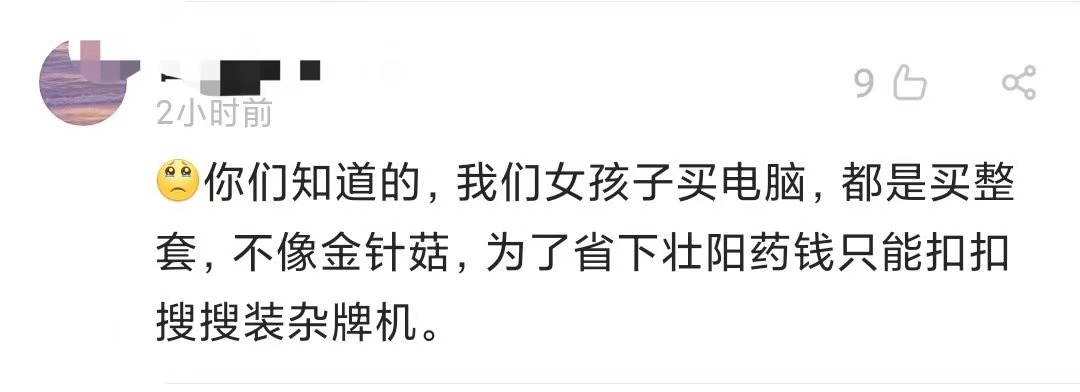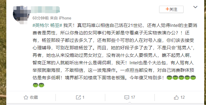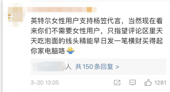 因為英特爾把楊笠的微博刪了,女的暴跳如雷把它衝了,從支持楊笠到曬單下單證明自己才是硬件羣體的消費用户。